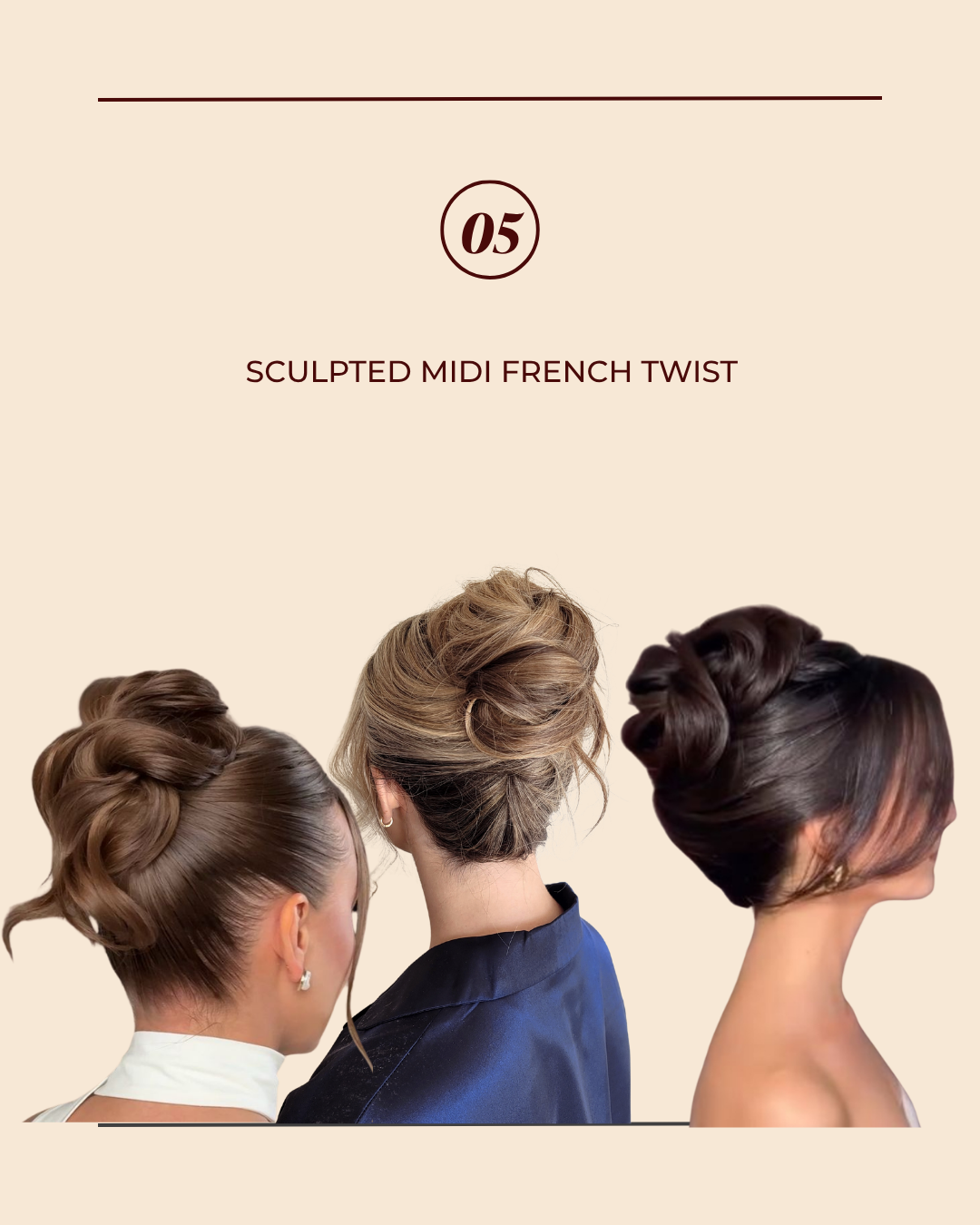 This style is a modern take on the classic French twist. The first inspo photo isn’t technically a French twist, but I love these midi buns that are intentionally twisted and pinned into place. The second and third styles lean more into a traditional twist, then are softly pinned with overlapping pieces to create a more sculpted, dimensional look.